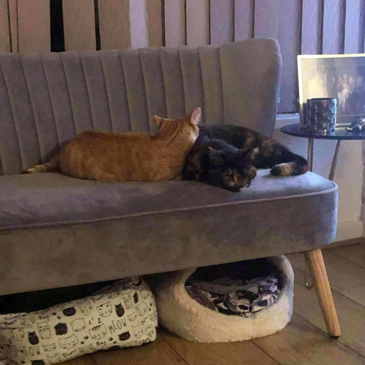 These lovely cats are a mum and daughter duo: Lotus (mum) and Biscoff (daughter). Lotus is an orange cat approximately 7 years old. Biscoff is a tortoise shell approximately 5 years old.