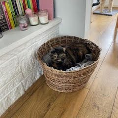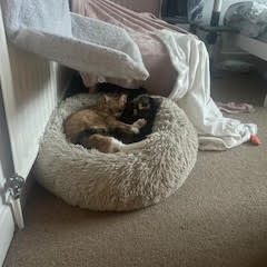 Both cats are quite sociable but shy. Lotus is happy to sit on your lap but doesn’t like to be picked up too much. She is happy to go into the garden but doesn’t wander off and can panic if she cannot get back into the house. Lotus loves her food and a comfy place to sleep (don’t we all)!!