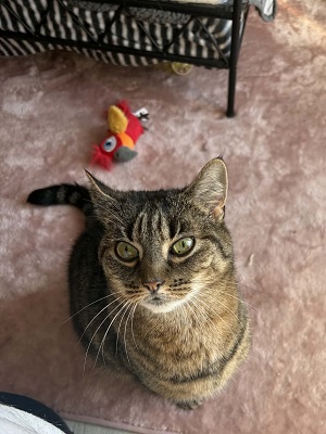 Poppy is a 10 Year Old tabby female and much loved pet. She’s quite timid however once she bonds with a person is very attentive and loving. She just needs someone willing to give her time and patience to build up trust.